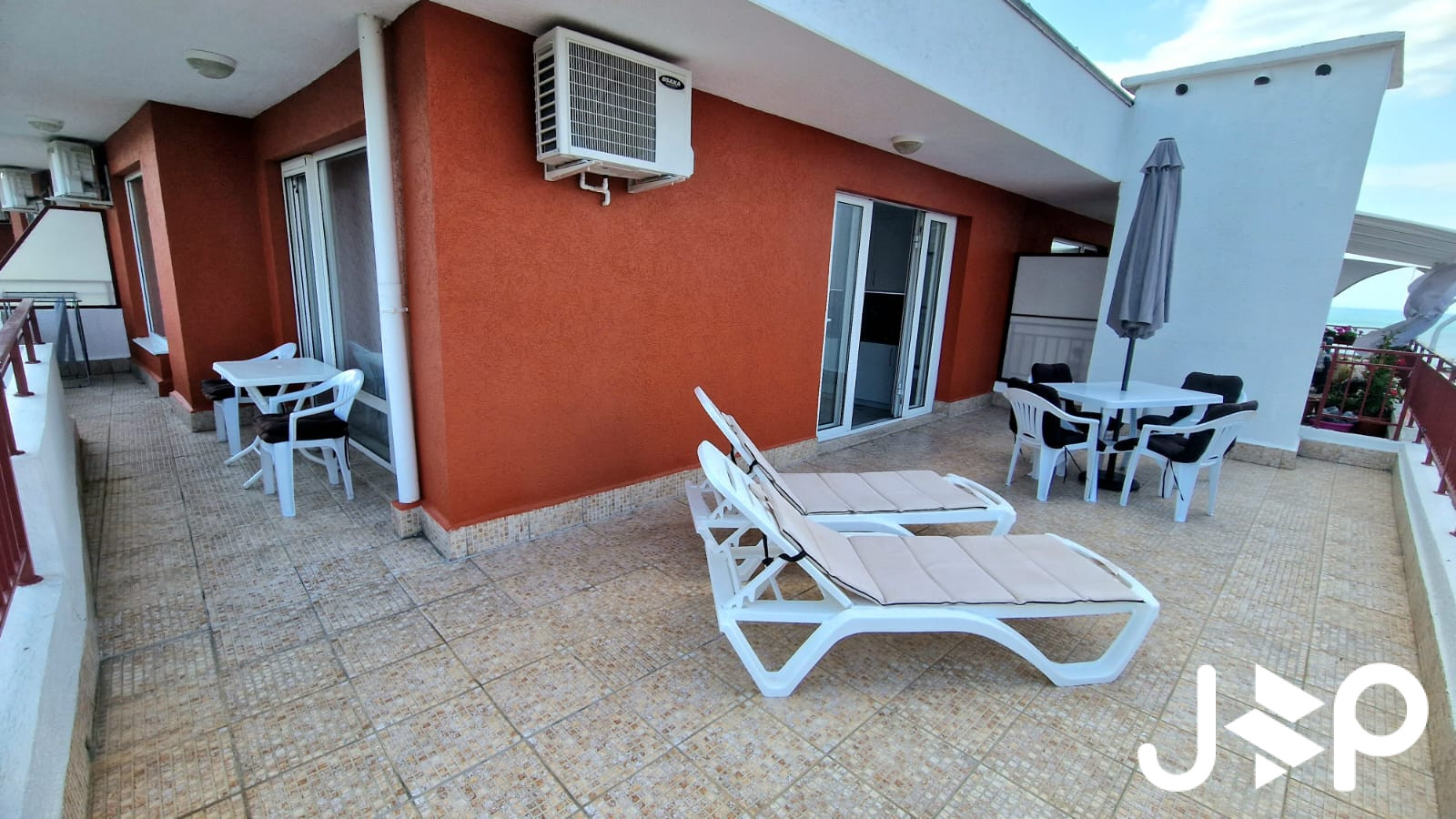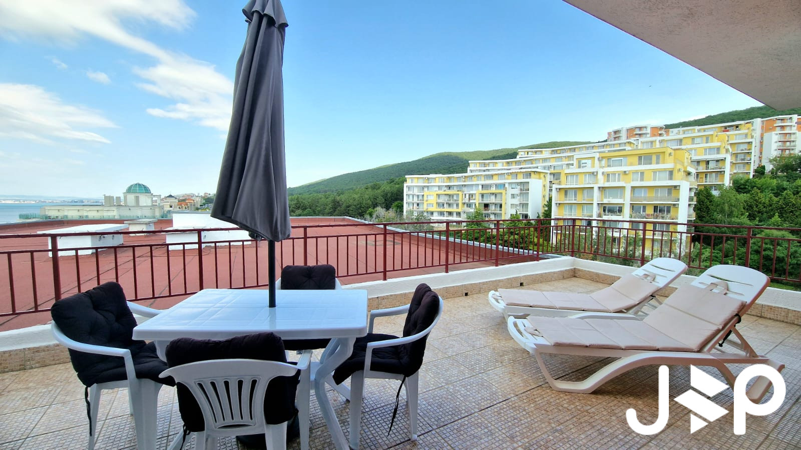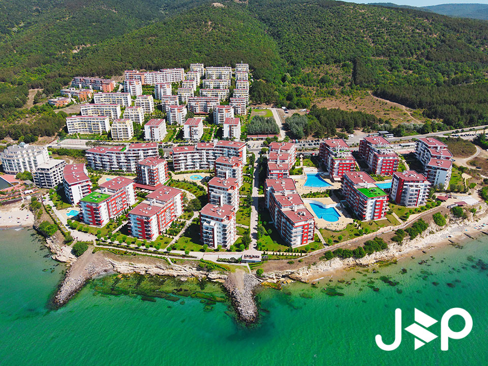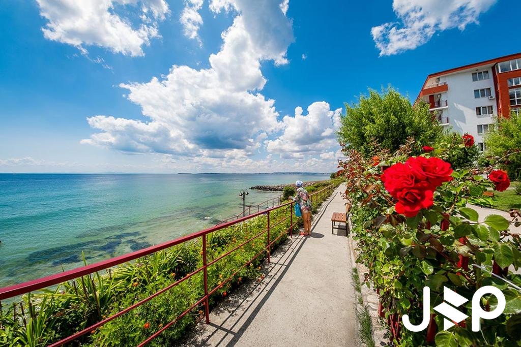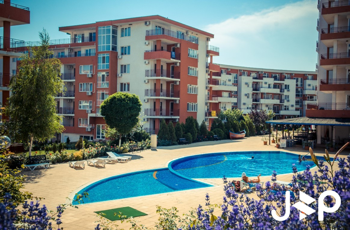 Lage: Direkt am Meer. Der Komplex liegt an einem Berghang, sodass sich von den meisten Apartments aus ein direkter Panoramablick auf das Meer und die Bucht von Sonnenstrand bietet.
