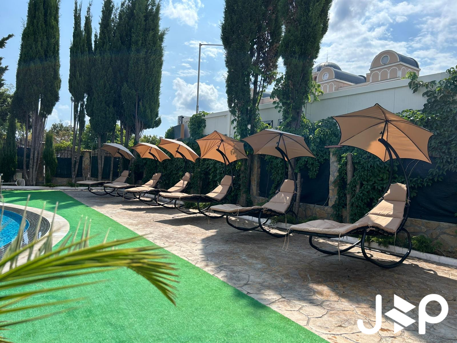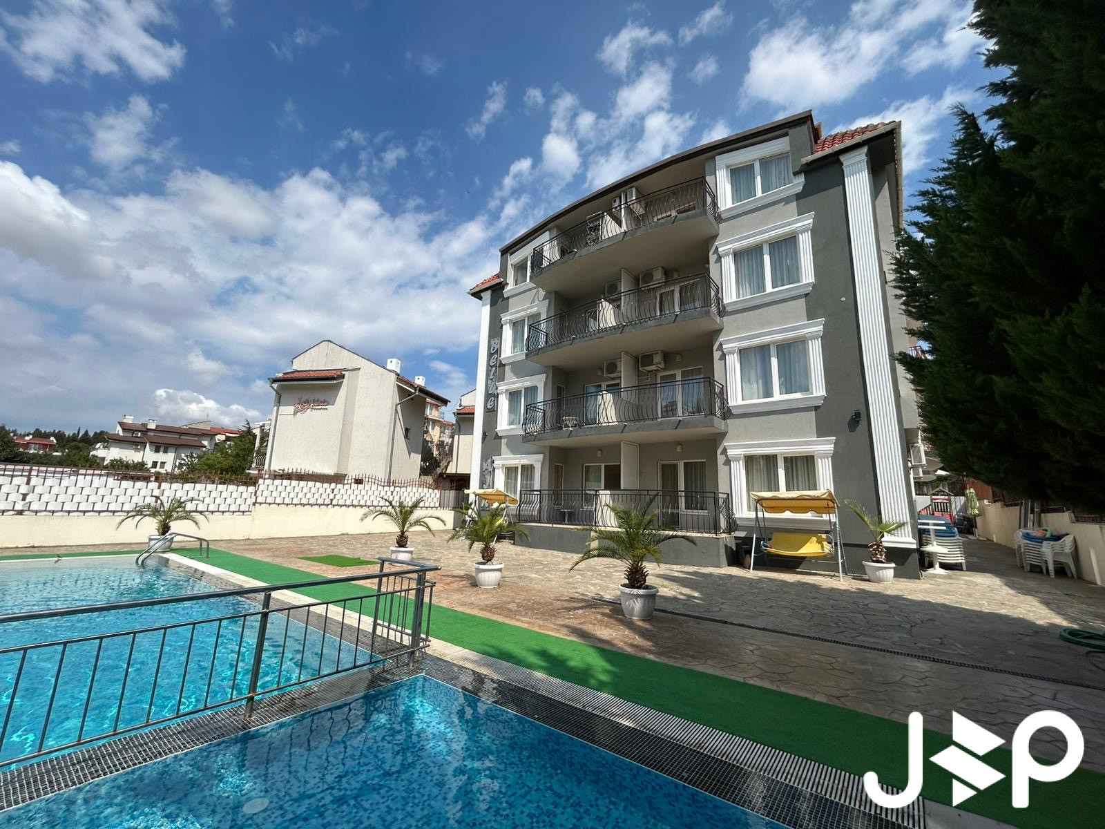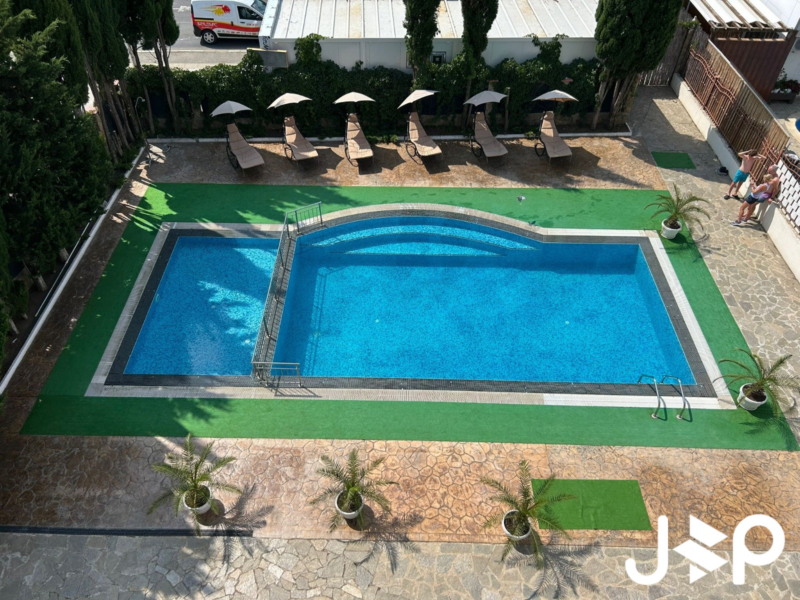 Открытый бассейн с детской секцией и зоной для загара.